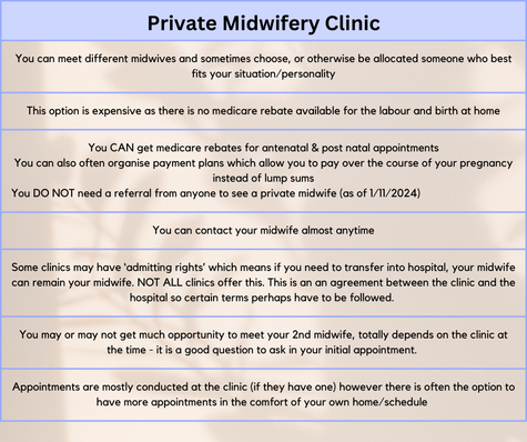 In Victoria, we have private midwives (either working as individuals or within a group) or PFHB (publicly funded homebirth).